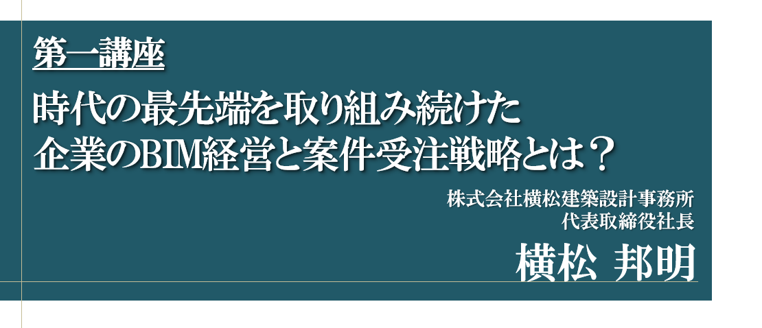 今回のゲスト講座は、株式会社横松建築設計事務所 代表取締役社長 横松邦明氏にお越しいただき、民間受注戦略とBIMを基軸とした経営についてお話しいただきました。