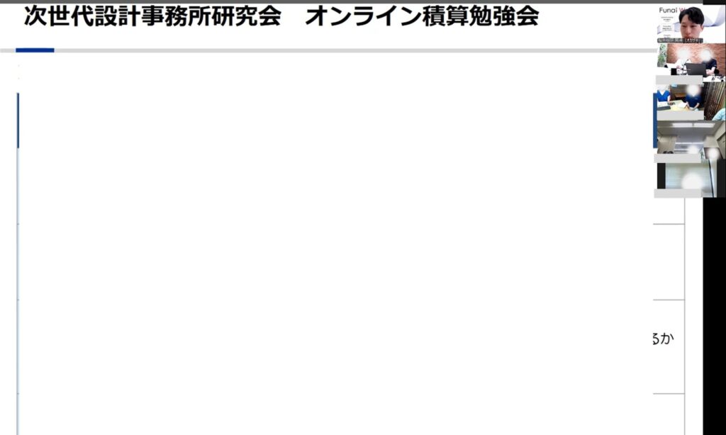 第8回次世代設計事務所研究会では、「【社員向け】積算方法」をテーマにオンライン勉強会を開催致しました。
